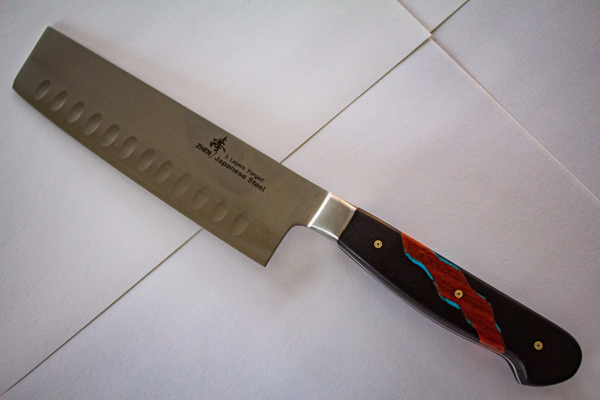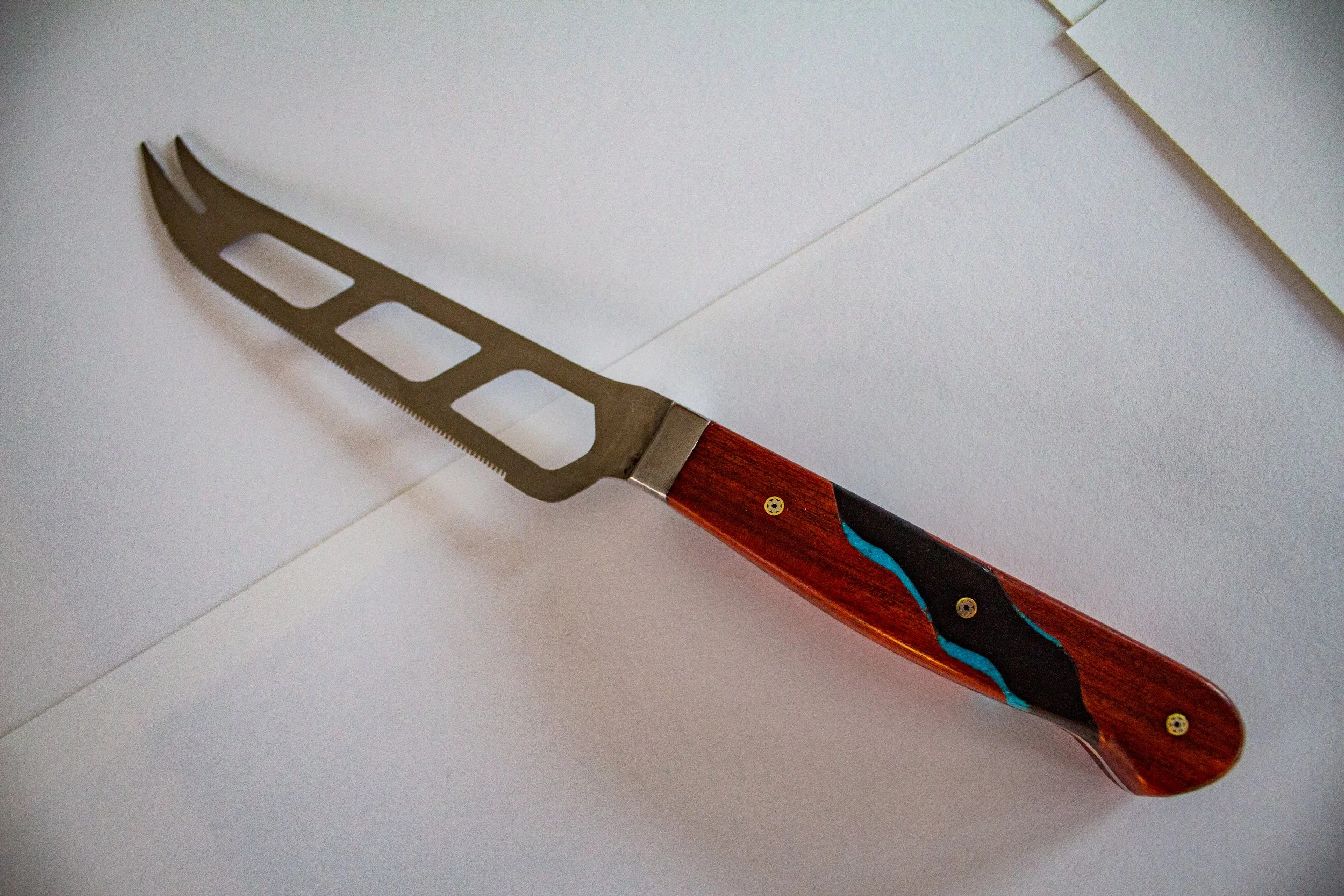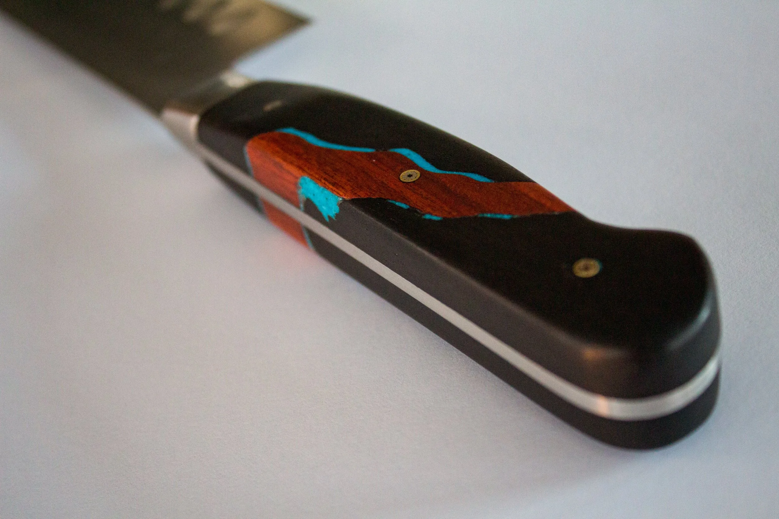 Mirror image rivers flow through the middle of these matching knife handles. Made of ebony and bloodwood, with the river banks inlaid with turquoise, these custom knives were the spark to bring my knifemaking public.